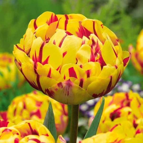 Тюльпан «Голден Ницца» – это настоящая жемчужина среди весенних цветов. Этот сорт отличается насыщенным желтым цветом с изысканными красными акцентами, которые придают цветку особую изюминку. Высота растения достигает 45-55 см, что делает его идеальным для создания ярких акцентов в саду или для срезки в букеты. Размер цветка – около 6-8 см в диаметре, а его бокаловидная форма сохраняется даже при ярком солнечном свете. «Голден Ницца» относится к классу Триумф-тюльпанов, которые известны своей устойчивостью к ветру и дождю, а также длительным периодом цветения.